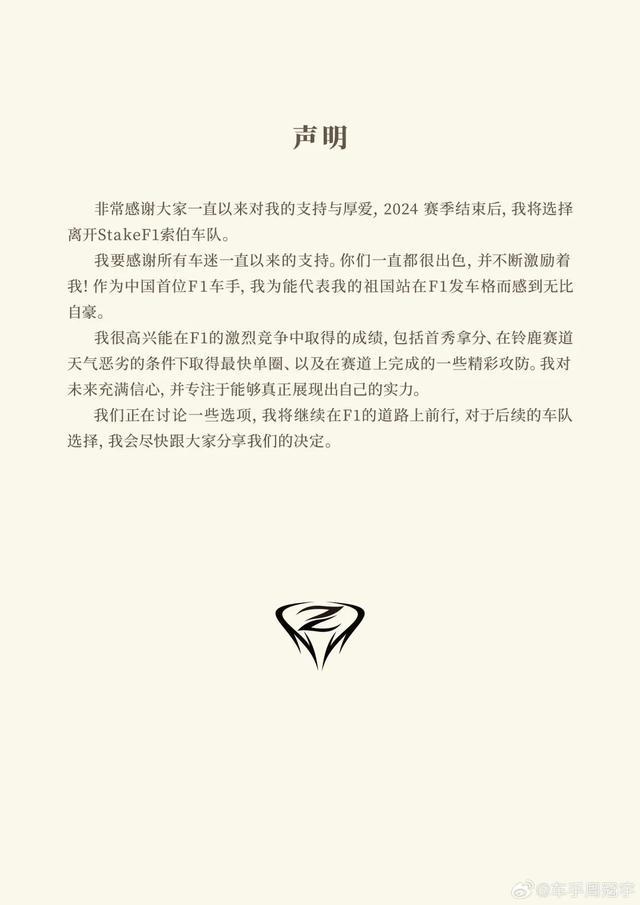 由于索伯车队在上赛季末公布了来年霍肯伯格和博托莱托的车手威望,因此周冠宇和博塔斯离开了索伯车队。天然失去了慎重车手席位,但周冠宇尔后就发布声明暗示我方“将延续在F1的谈路向前行”!成果在今天,适值新春佳节,中国车迷们终于迎来了好音信!