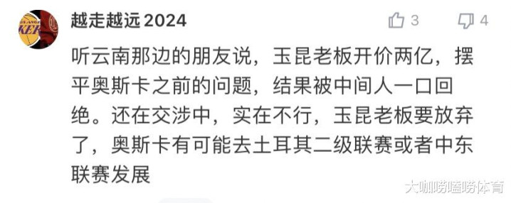 央视博主孙文志聊球搪塞媒体发文夸耀,奥斯卡的归化失败,原因与钱无关。他无法入籍的原因出在他我方身上。而这个原因是整个无法让咱们首肯他入籍的!而随后又有知情东说念主夸耀,云南玉昆雇主空闲开2亿摆平奥斯卡之前的事情,成果被中间东说念主一口绝交了!据悉,奥斯卡接下来很可能会去到中东或者土耳其二级联赛效率。