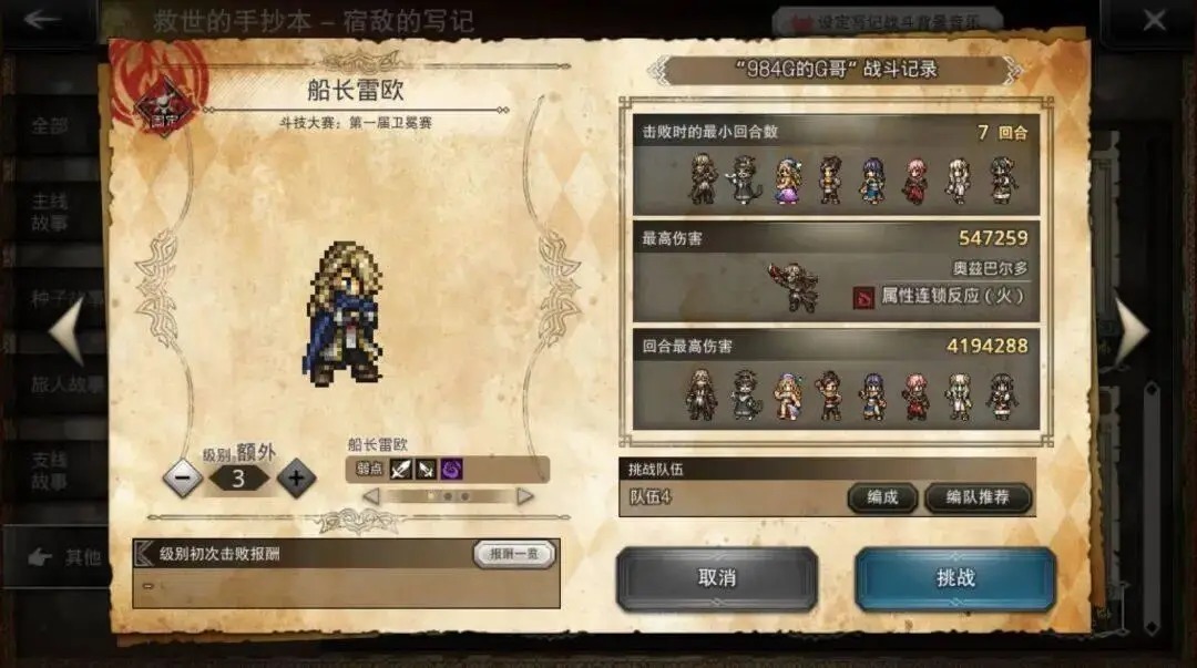 开打之前G哥澈底没把雷欧当回事,看了一下现成的戎行里有一套完成过 波斗一穿四的属攻队,树立为1觉10必、10必、4觉10必、1觉、4觉10必、骨子、20必、骨子,觉得不会有啥问题奏凯开打,后果打着打着发现卡娜莉没带群攻,奥爹和彩匕没带冰属性报复,在解决第二波小怪时打得十分歧扭。
